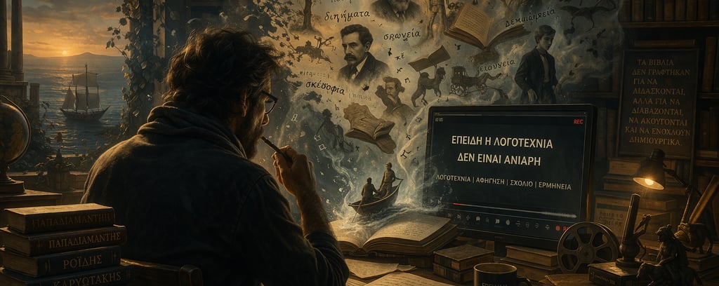 Η ελληνική λογοτεχνία δεν είναι ανιαρή. Στο κανάλι αυτό η ελληνική λογοτεχνία παρουσιάζεται ως ζωντανός λόγος και όχι ως σχολικό απολίθωμα. Διηγήματα, ποιήματα και λογοτεχνικά κείμενα προσεγγίζονται μέσα από οπτικοακουστικές παρουσιάσεις με αφήγηση, σχόλιο και ερμηνεία. Κλασικοί και νεότεροι συγγραφείς – από τον Παπαδιαμάντη και τον Ροΐδη έως λιγότερο προβεβλημένες φωνές της νεοελληνικής γραμματείας – διαβάζονται χωρίς ξύλινο λόγο, χωρίς αγιογραφίες και χωρίς φόβο απέναντι στην ειρωνεία, τη σάτιρα ή τη φιλοσοφική τους διάσταση. Το περιεχόμενο δεν περιορίζεται σε απλή απαγγελία ή ηχητικό βιβλίο. Κάθε κείμενο μετατρέπεται σε οπτικοακουστική εμπειρία, με εικαστική σύνθεση και κινηματογραφική ροή, ώστε η λογοτεχνία να ακούγεται, να βιώνεται και να ενεργοποιεί τη σκέψη. Ένα κανάλι για όσους πιστεύουν ότι τα βιβλία δεν γράφτηκαν για να «διδάσκονται», αλλά για να διαβάζονται, να ακούγονται και να ενοχλούν δημιουργικά.